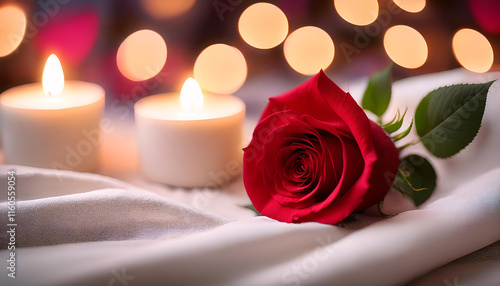A single red rose rests elegantly on luxurious white satin, its petals illuminated by the warm glow of nearby candles
