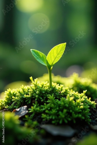A single sprout grows slowly through a layer of moss on the forest floor, forest floor, botany, plant growth