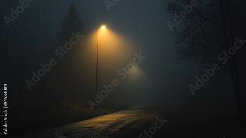 A single street light casting a beam of light into the fog, creating a sense of mystery and isolation,