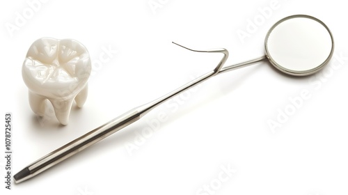 A Single Tooth Standing Isolated with a Tool Beside It on a Clean White Background. Detailed View of Dental Object and Associated Implement in a Plain Setting.