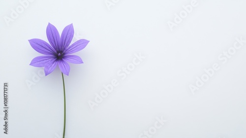 A single vibrant lavender flower placed elegantly on a white background, with its delicate purple petals standing out against the