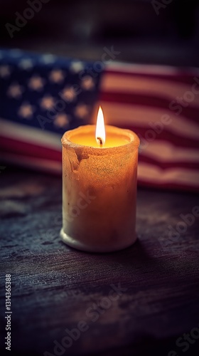 A single white candle flickers in the dim light, placed next to a neatly folded American flag, symbolizing quiet reflection in the photo.