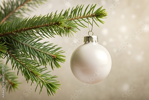 A single white christmas ornament hangs from a green pine branch with a soft bokeh background