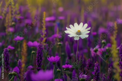 single, white, flower, field, purple, bloom, contrast, beauty, floral, meadow, vibrant, colours, stand out, unique, flora, nature, wildflower, solitary, picturesque, pop, striking, harmony, landscape, composition