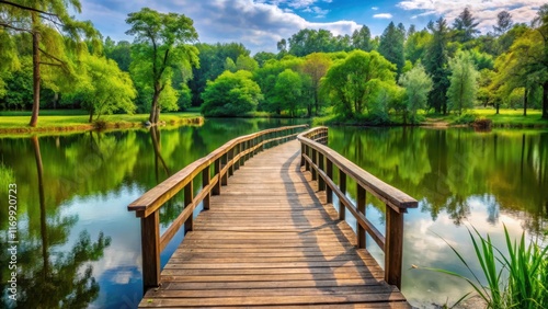 A single wooden bridge spanning a serene lake with lush greenery and trees on both sides in the background