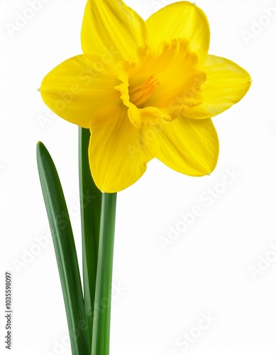 daffodil, yellow flower, spring flower, flower, bloom, floral, springtime, nature, plant, green, white background, isolated, single, bright yellow, spring, garden, sunshine, fresh, delicate, natural, beautiful, vibrant, yellow