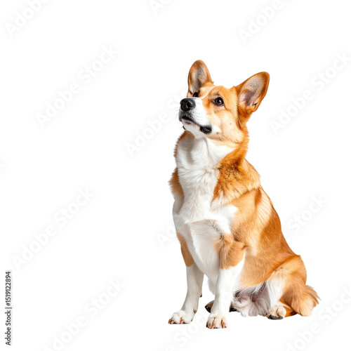 A sitting Pembroke Welsh Corgi with a tan and white coat, alert ears, and a focused gaze looking slightly upward