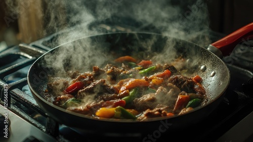A sizzling hot pan on a stove, filled with vibrant vegetables and juicy meat, steam rising to create an inviting aroma, perfect for showcasing delicious home-cooked meals.