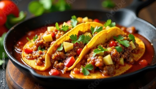 A sizzling hot skillet filled with spicy tacos al pastor, salsa, bell pepper, pineapple