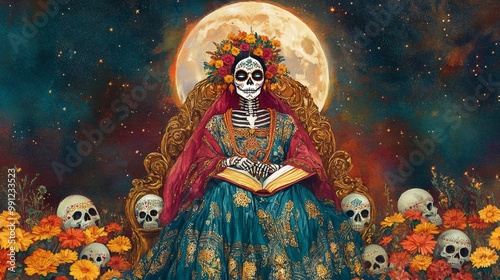 skeleton, flower, moon, book, throne, colourful, culture, celebration, day of the dead, vibrant, ornate, decorative, traditional, festive, art, imagery, symbolism, holiday, remembrance, beauty, nature, history, ritual, spirituality, community, honour, memory, joy, life, death, heritage, design, pattern, texture, arrangement, shadow, light, colours, expression, folklore, character, scene, atmosphere, elegance, grace, costume, significance, visual, storytelling