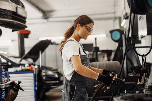 A skilled female mechanic uses tools in a modern auto shop, showcasing her expertise in automotive repair