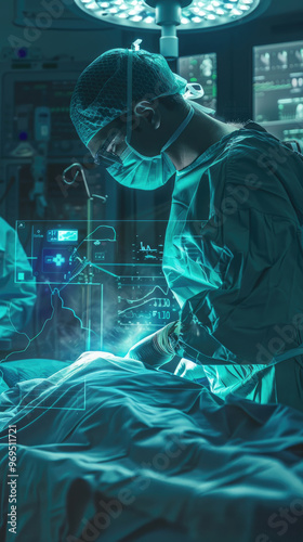 A skilled surgeon concentrates on a delicate procedure while utilizing high-tech equipment and monitoring vital signs in the operating room
