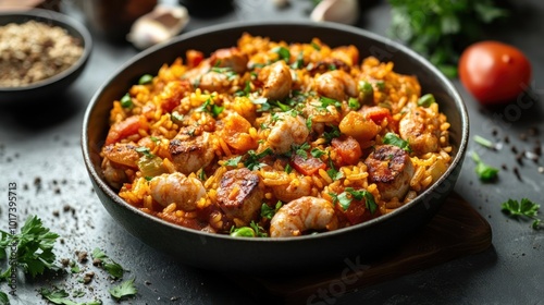 a skillet filled with chicken and rice on top of a wooden cutting board