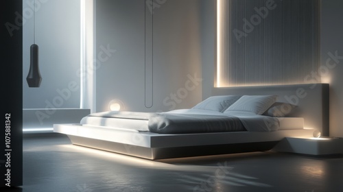 A sleek and minimalist bedroom design with a platform bed,