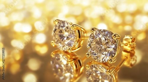 A sleek and modern composition of diamond earrings placed on a reflective gold plate.