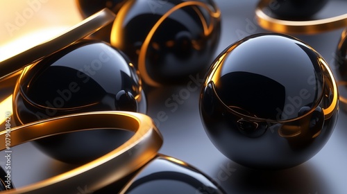 A sleek arrangement of glossy black spheres and metallic golden rings, forming a futuristic geometric composition with smooth, fluid lighting and shadows.