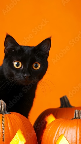 sleek, black, cat, sitting, gracefully, among, group, carved, pumpkin, glowing, candlelight, inside, casting, eerie, shadow, eye, wide, open, directly, camera, animal, pet, kitten, felino, cute, domestic, fur, portrait, pet, white, mammal, nature, cat, eye, animal, young, fluffy, hair, orange, red, blue, halloween, funny, art, cat, symbol, pumpkin, design, sweet