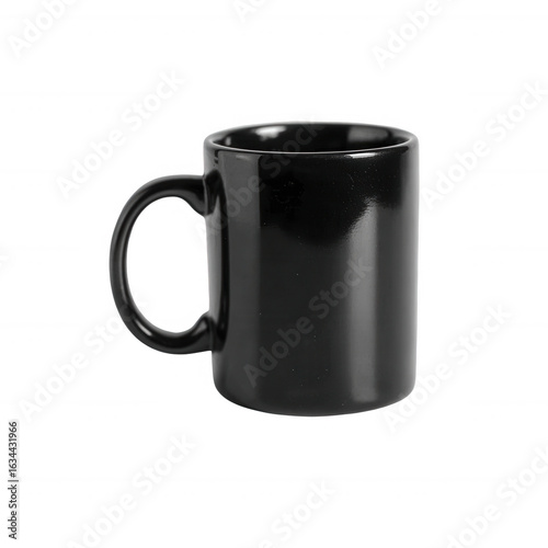 A sleek black coffee mug isolated on a white background, perfect for showcasing beverages or serving as a stylish accessory in any kitchen.