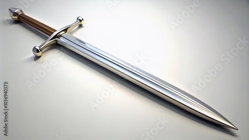 A sleek, double-edged sword stands upright against a pristine white background, its polished metal gleaming sharply, conveying power, strength, and ancient warrior spirit.