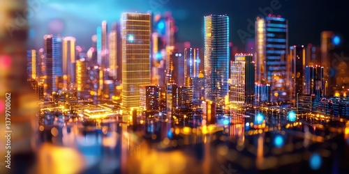 A sleek, futuristic cityscape, built entirely of intricate, interconnected blocks that shimmer and glow, forming an urban landscape that seems to defy the laws of physics