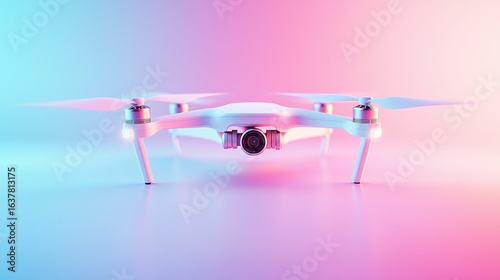 A sleek, modern drone with a camera, illuminated in vibrant pink and blue hues, showcasing its futuristic design against a smooth background.