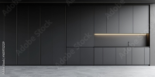 A sleek, modern kitchen features a long, dark gray cabinet unit spanning the entire wall. The cabinets are tall and rectangular with recessed panel doors.