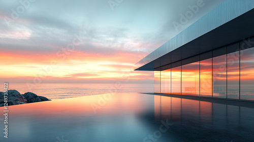 A sleek modern office with shiny metal and large glass windows near a coastal road, symbolizing business, progress, and connection, set in a bright, minimalist environment with a blurred background