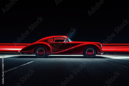 A sleek, red classic car sits on a dark asphalt road, with blurred red light trails in the background.
