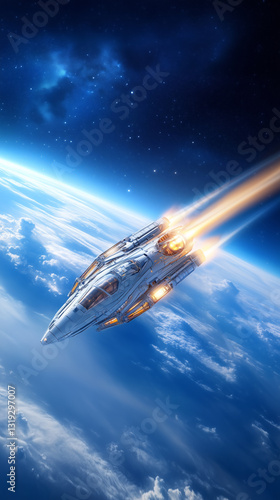 A sleek spacecraft soars into the depths of space, emitting bright flames while leaving behind a mesmerizing trail. Below, clouds and atmospheric layers peek through the darkness of space