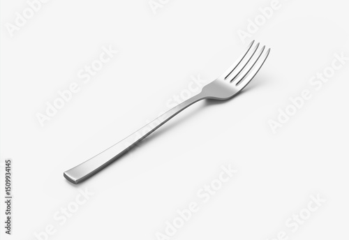 A sleek stainless steel fork with a reflective finish and a slightly curved handle. 3D Illustration