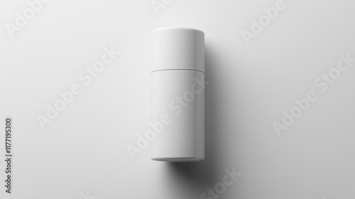 A sleek white cylinder container stands upright on a light gray surface, showcasing a minimalist design with no visible branding or labels. The overall aesthetic is modern and clean.