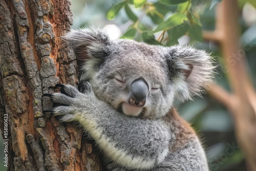 A sleepy koala bear hugging the trunk of a eucalyptus tree, with its eyes half-closed and one ear twitching