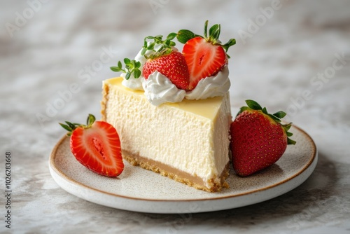 A slice of creamy New York-style cheesecake topped with fresh strawberries and whipped cream