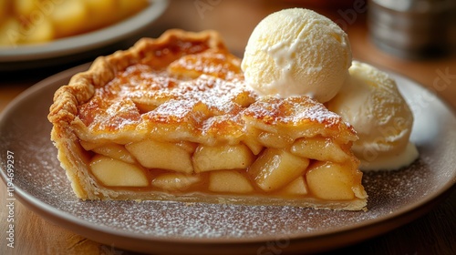 A slice of delicious apple pie, served warm with a scoop of vanilla ice cream. A delightful dessert treat perfect for any occasion. Enjoy the golden-brown crust and sweet apple filling.
