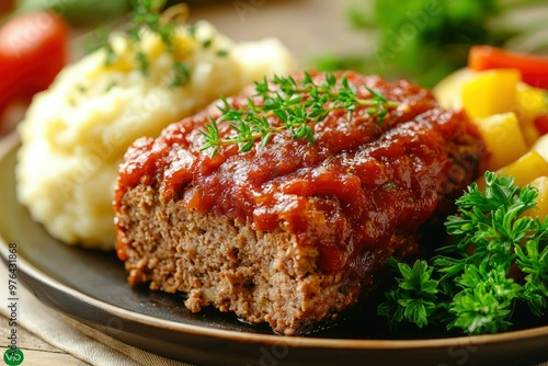 A Slice of Meatloaf with Tomato Sauce and Mashed Potatoes