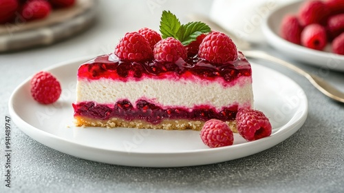 A slice of no-bake raspberry cheesecake with a jelly layer, topped with vibrant fresh raspberries and served on a white plate, on a rustic gray concrete table.