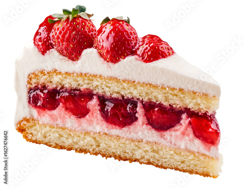 A slice of strawberry shortcake with whipped cream and fresh strawberries, on a plate with a fork, isolated on white