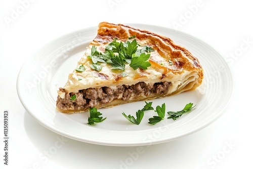 meat pie, slice, plate, savoury, homemade, baked, hearty, closeup, delicious, traditional, rustic, comfort food, dinner, classic, filling, baked goods, food photography, protein, rich, epicure, detailed, parsley, satisfying, balanced, food, meal, salad, meat, vegetable, cheese, fish, bread