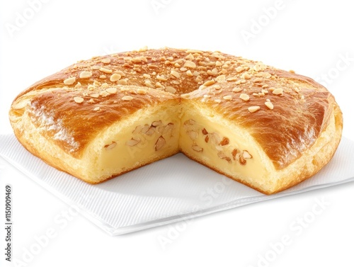 A sliced pastry revealing a creamy filling and topped with nuts, served on a napkin.