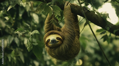 A sloth hanging upside down from a tree branch in the Amazon rainforest, its slow movements blending with the dense green foliage and vines all around.