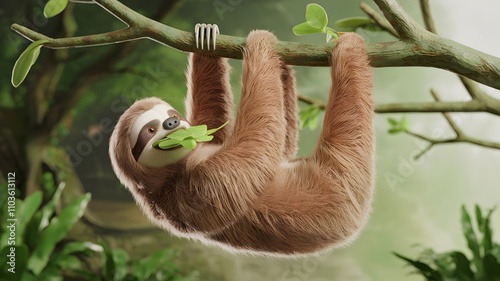 A sloth is leisurely hanging from a tree branch, eating leaves