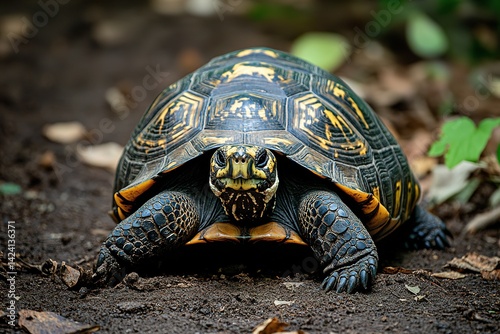 A slow-moving tortoise with a patterned shell, resting on the ground, exuding tranquility