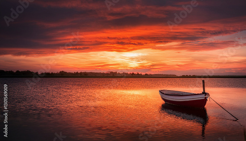 A small boat floats peacefully on a calm lake under a breathtaking crimson sunset sky.