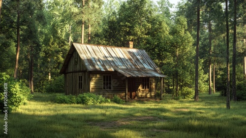cabin, forest, wood, tree, green, nature, landscape, rural, rustic, wood, log, house, home, building, scenery, sun, light, shadow, path, grass, leaf, branch, summer, day, tranquil, peaceful, serene, isolated, remote, countryside, wild, wildlife, natural, environment, outdoors, solitude, recreation, escape, get-away, hiking, camping, adventure, cosy