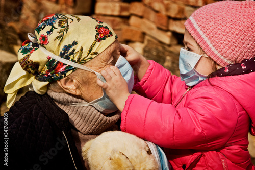 A small child in a medical mask adjusts the mask on his grandmother's face. A masked child on a face during a coronavirus pandemic. An old grandmother and a masked child on self-isolation