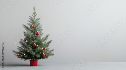 A small Christmas tree decorated with red ornaments and lights in a minimalist setting.