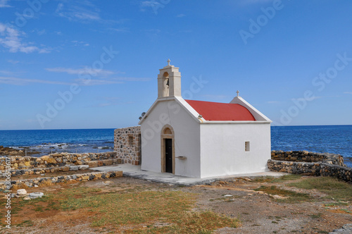 A small Church with bell on the edge of the stonecoast of the Aegean sea in Greece