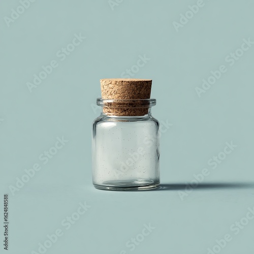 A small clear glass jar sealed with a natural cork stopper on a plain light blue background.