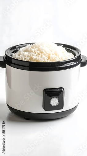 A small electric rice cooker filled with fluffy white cooked rice sits on a plain white background, ready to serve a simple, healthy meal to a hungry family.