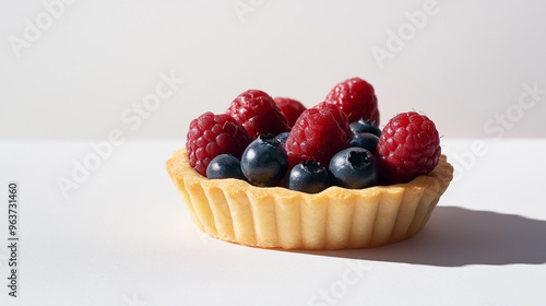 a small fruit tart with fresh berries and a glaze finish against an isolated white background